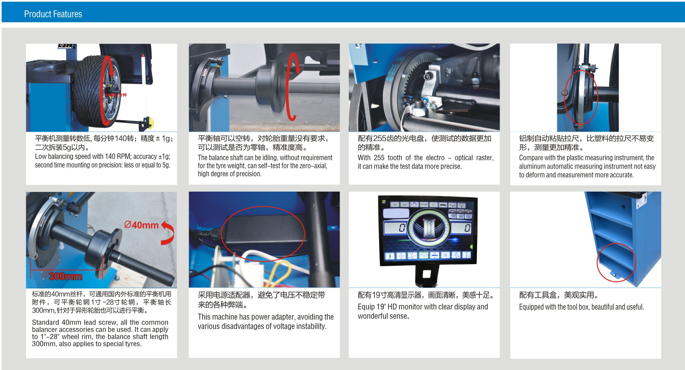 5. 표준 40mm 리드 나사, 모든 일반적인 밸런서 액세서리를 사용할 수 있습니다.1-28인치 휠 림, 밸런스 샤프트 길이 300mm에 적용할 수 있으며 특수 타이어에도 적용됩니다.